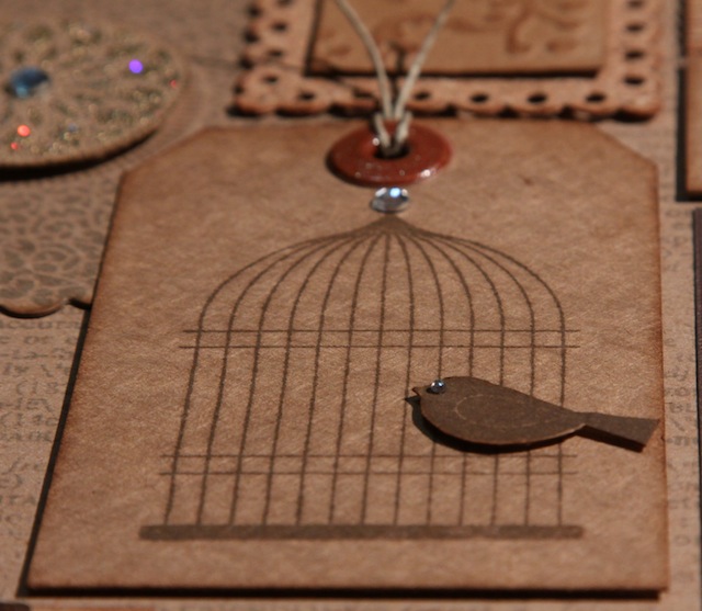 Ho costruito la struttura del bigliettino con il colore più scuro, ho embossato a freddo con una fustella della Sizzix il cartoncino più chiaro e l’ho applicato sopra quello scuro, stondandone gli angoli e distressando lievemente i bordi.